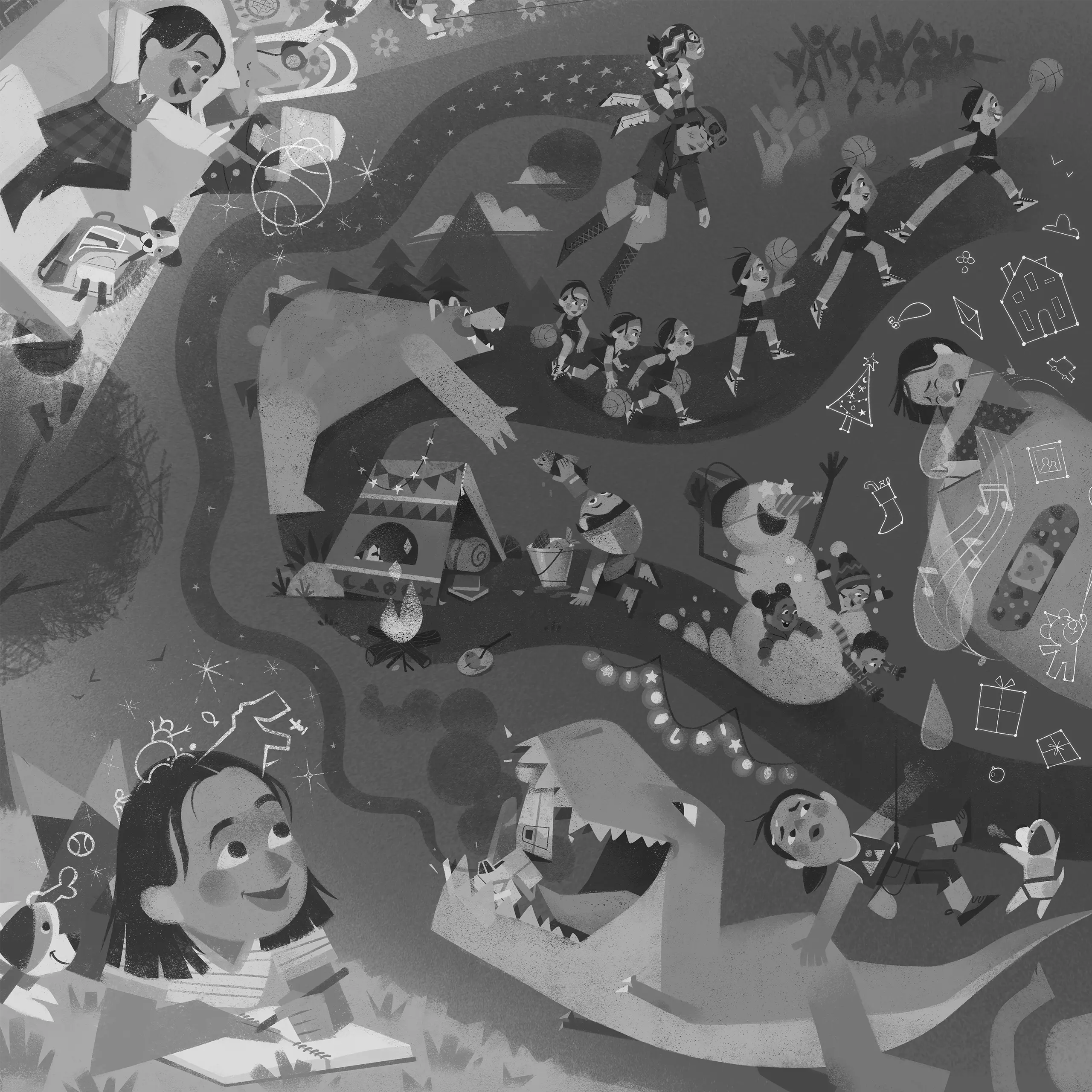 An initial sketch of the Layla’s dreams and imagination, an illustration I’m currenty working on. This is the first page of a double-page spread.